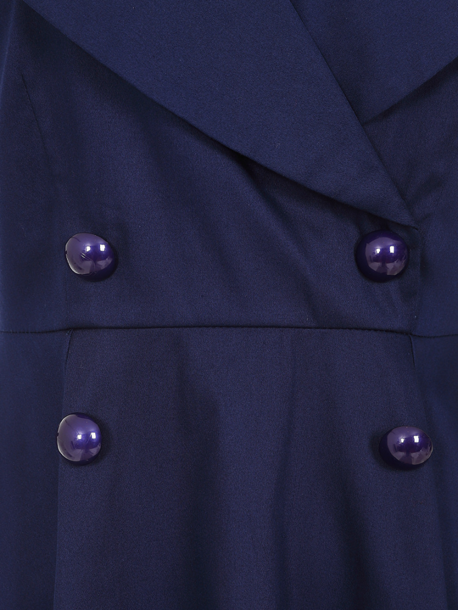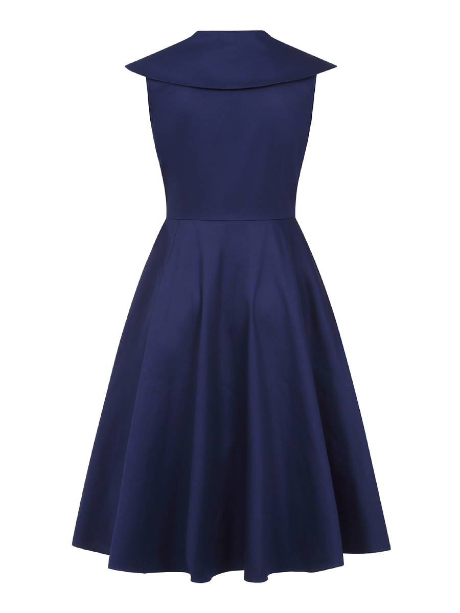 Lust auf einen eleganten maritimen Look ohne Sailor-Klischees? Dann ist dieses ärmellose dunkelblaue Kleid im 50er Jahre Stil "Isla Swing Dress Navy" von Banned genau das Richtige! Dieses sommerliche Kleid aus angenehmem Baumwollstoff hat einen schönen V-Ausschnitt mit extravagantem Kragen. Das Oberteil ist figurbetont mit vier glänzenden Zierknöpfen vorn, der weit schwingende Rock sieht mit und ohne Petticoat toll aus. Seitlicher Reißverschluss, zwei seitliche Eingrifftaschen im Rock. Ein wunderbar vielseitiges Kleid mit dezenter Eleganz!