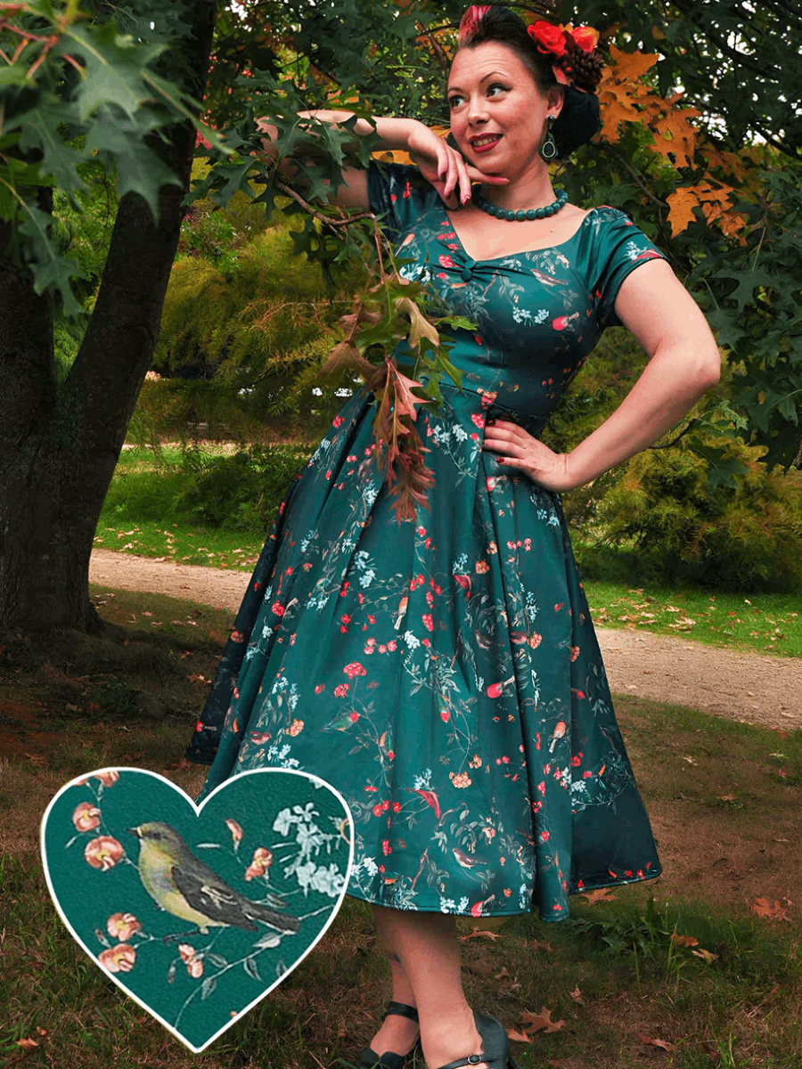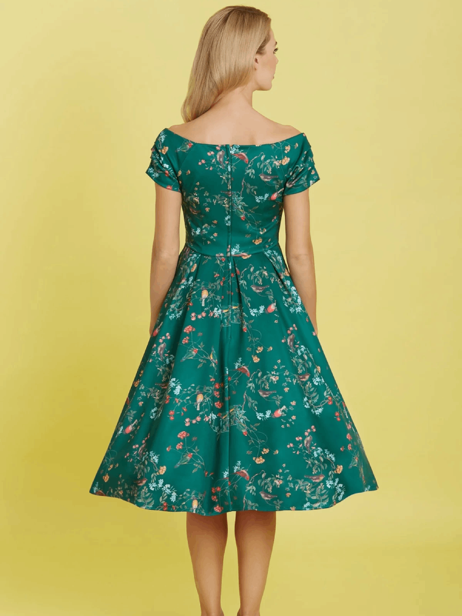 Ein Kleid wie ein romantischer Waldspaziergang! Dieses dunkelgrüne Petticoatkleid "Lily Green Bird Forest Off Shoulder Swing Dress" von Dolly and Dotty versetzt uns mit seinem zauberhaften Print mit Blumen und Vögeln direkt in die Natur. Das Kleid hat einen weiten Ausschnitt im Carmen-Stil mit kurzen Ärmeln und einem V-Ausschnitt vorn, der mit passenden Zierknöpfen dekoriert ist. Der weit schwingende Rock ist an der Taille in Falten gelegt und schwingt mit oder ohne Petticoat. Zwei Eingrifftaschen im Rock, Reißverschluss im Rücken.
