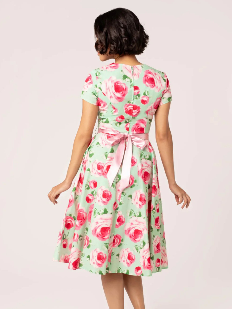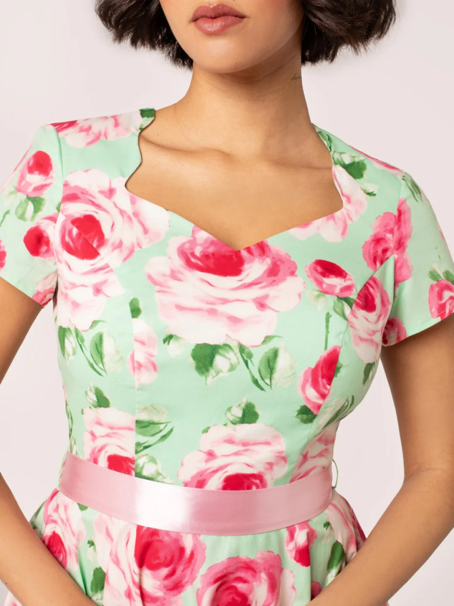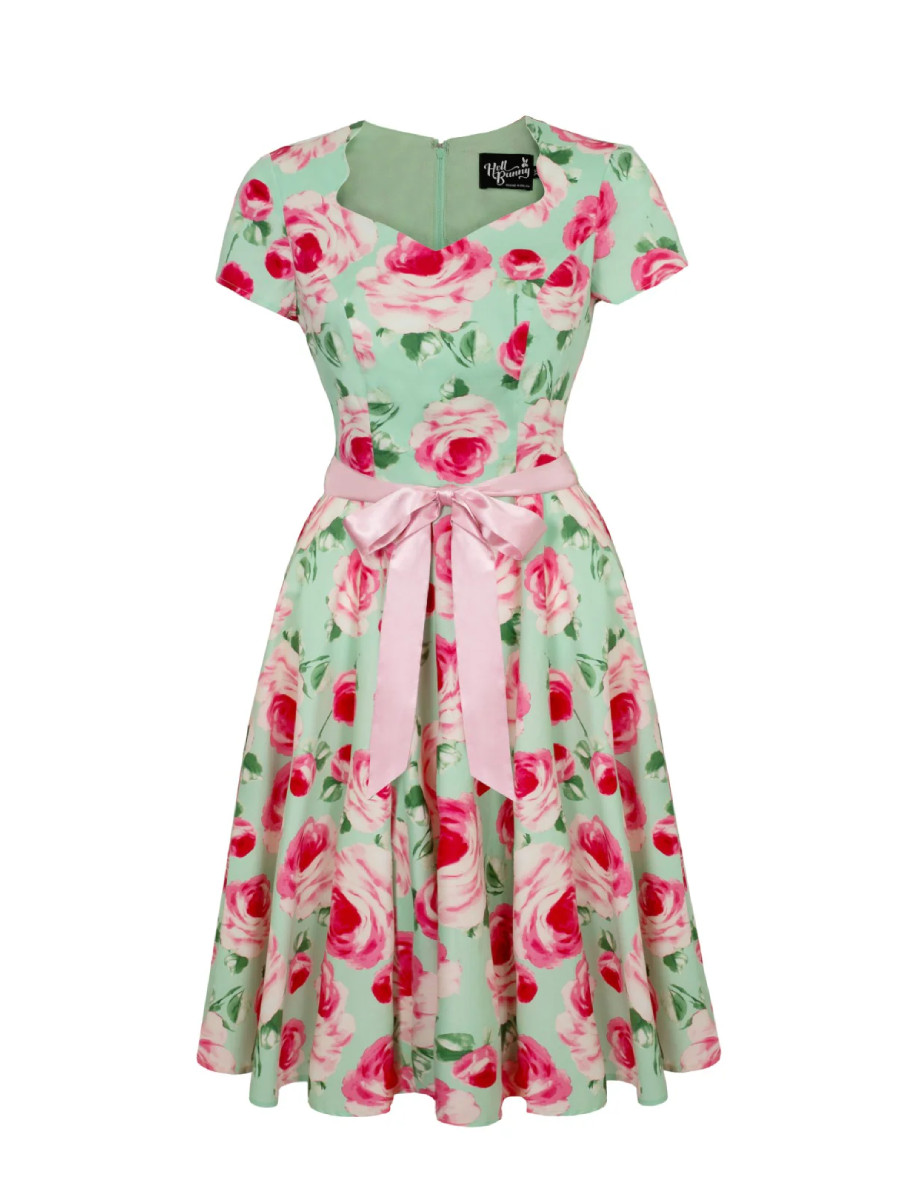 Ein Rosen-Traum in Pastell: Hellgrünes Petticoatkleid im 50er Jahre Stil "Camille Dress Mint" von Hell Bunny mit wunderschönen rosa Rosen. Figurbetontes Oberteil mit V-Ausschnitt und kurzen Flügelärmeln, perfekt für den Sommer. Der weit schwingende Rock macht mit und ohne Petticoat eine zauberhafte Figur, er hat zwei praktische seitliche Eingrifftaschen. Ein zartrosa Satinband sorgt für eine perfekte Pinup-Taille. Reißverschluss im Rücken. Ein Rosen-Traum für alle, die es romantisch lieben!