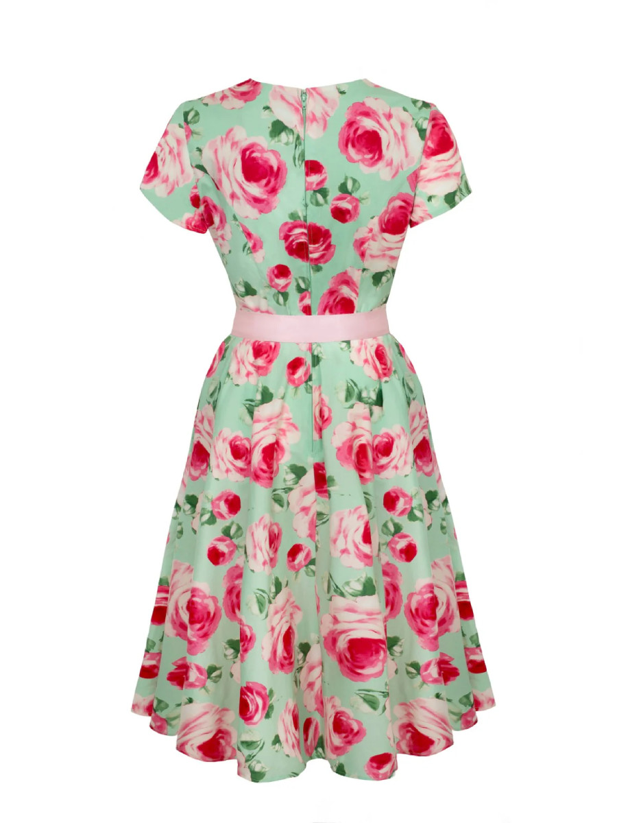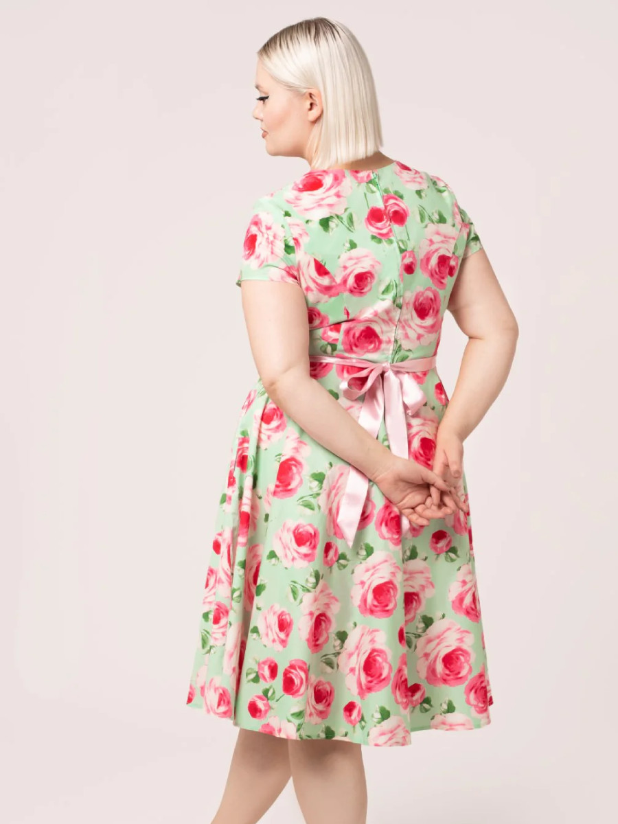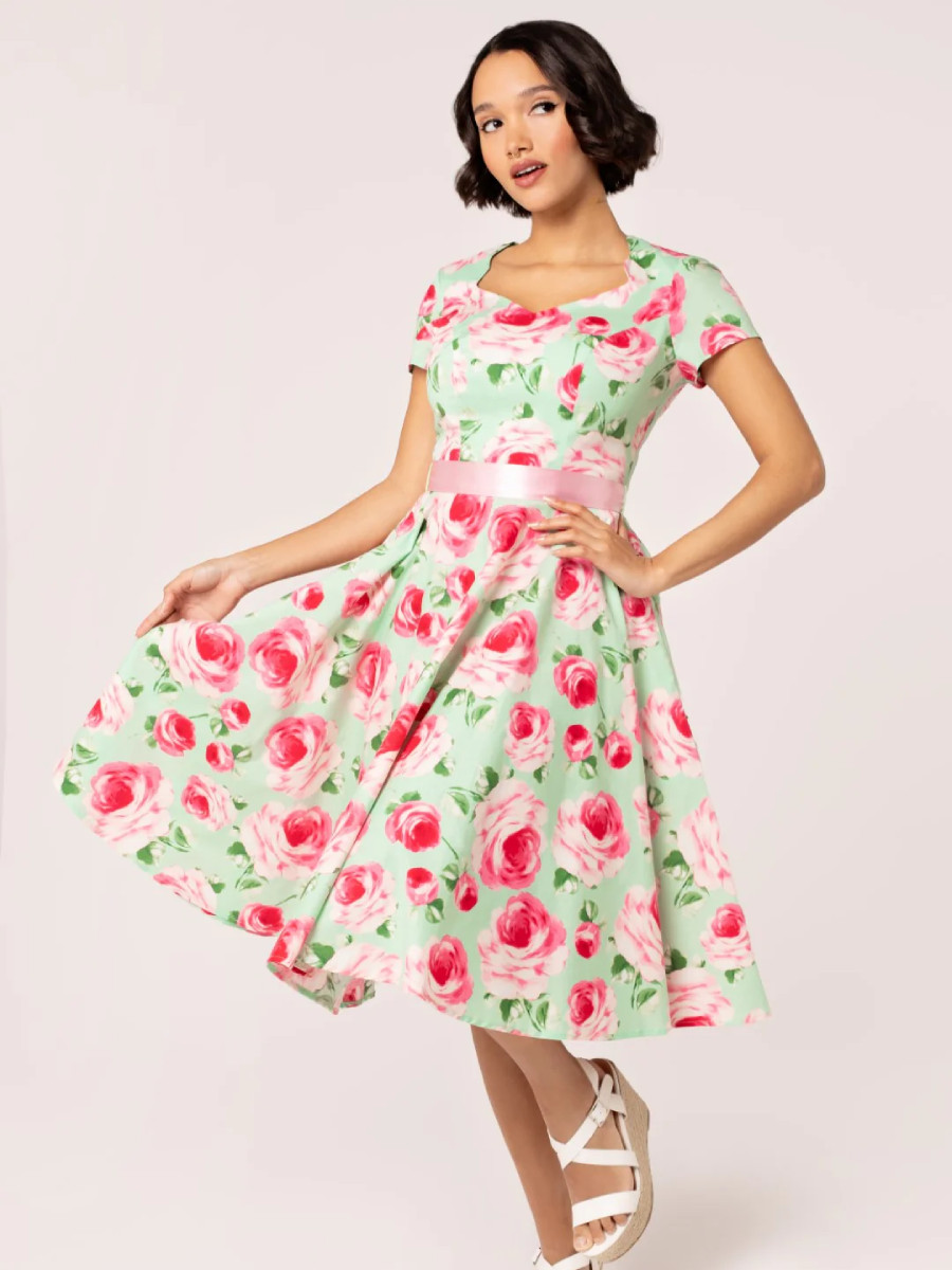 Ein Rosen-Traum in Pastell: Hellgrünes Petticoatkleid im 50er Jahre Stil "Camille Dress Mint" von Hell Bunny mit wunderschönen rosa Rosen. Figurbetontes Oberteil mit V-Ausschnitt und kurzen Flügelärmeln, perfekt für den Sommer. Der weit schwingende Rock macht mit und ohne Petticoat eine zauberhafte Figur, er hat zwei praktische seitliche Eingrifftaschen. Ein zartrosa Satinband sorgt für eine perfekte Pinup-Taille. Reißverschluss im Rücken. Ein Rosen-Traum für alle, die es romantisch lieben!
