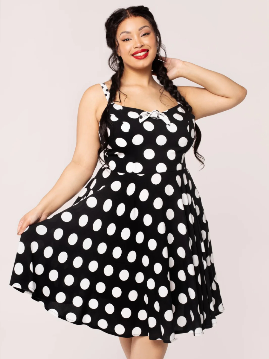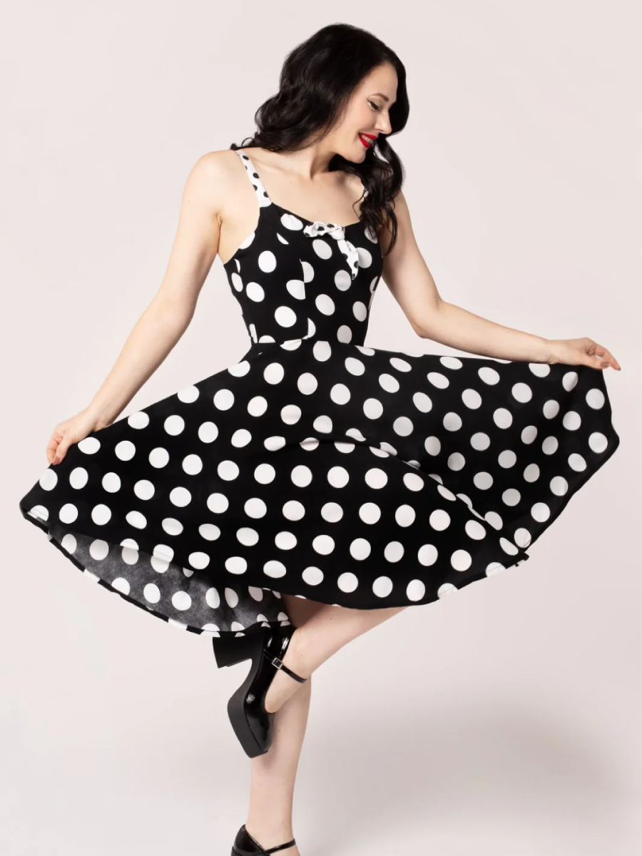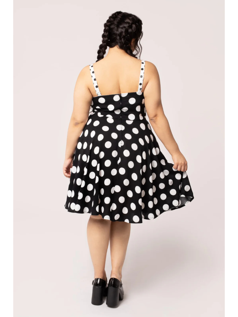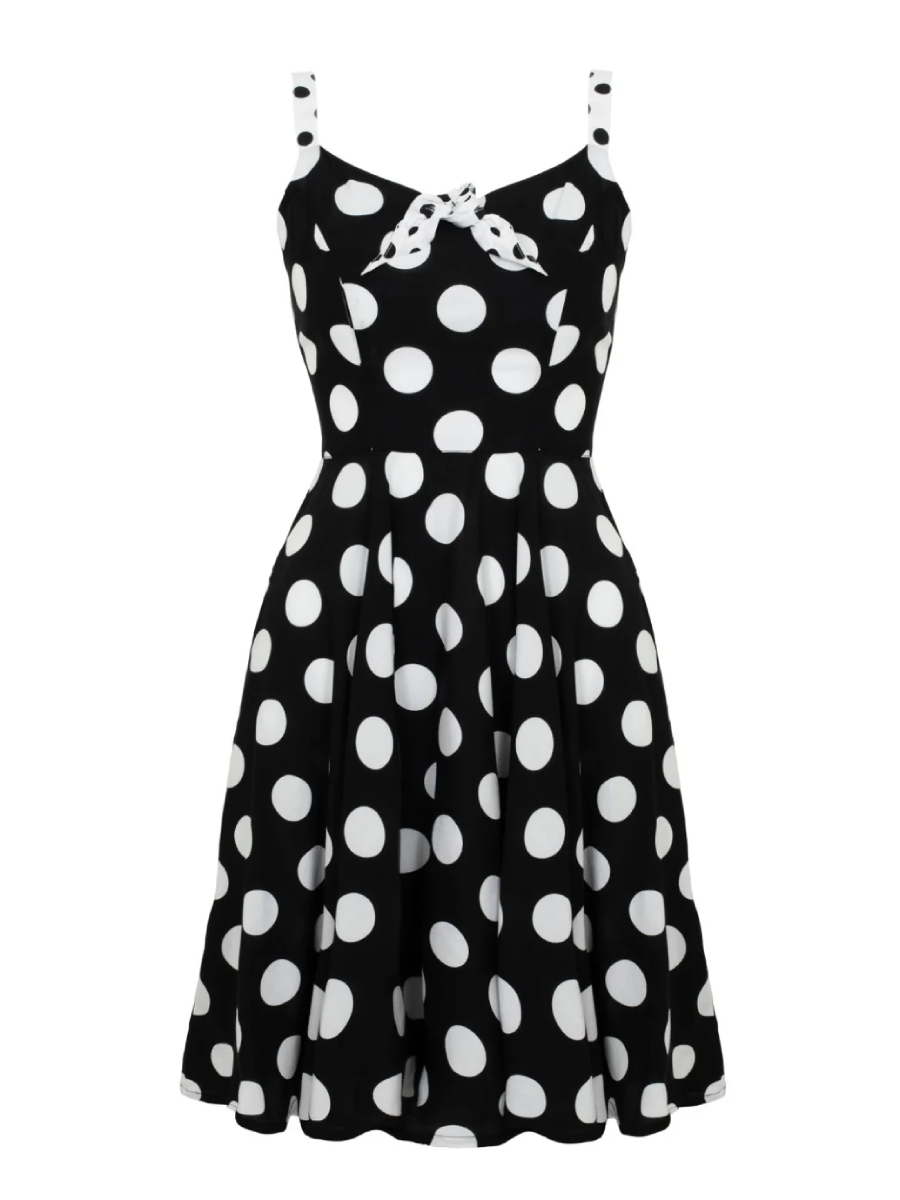 Ein Gute-Laune-Kleid für den Sommer! Sommerlich-leichtes schwarz-weißes Petticoatkleid im 50er Jahre Stil "Dolores Dress" von Hell Bunny mit riesengroßen XXL Polkadots. Figurbetontes Oberteil mit Herzausschnitt und kontrastierender weiß-schwarzer Schleife am Ausschnitt, Abnäher vorn sorgen für einen guten Sitz. Das Oberteil ist innen weiß gefüttert. Schmale weiß-schwarze verstellbare Träger. Weit schwingender Rock mit zwei seitlichen Eingrifftaschen, Reißverschluss im Rücken. Das Kleid supersüße Kleid kann mit oder ohne Petticoat getragen werden.
