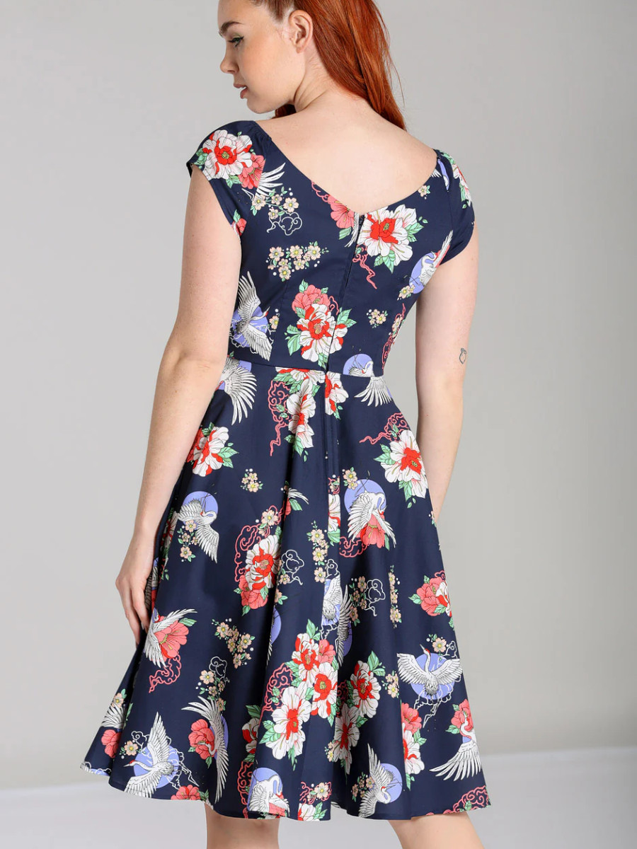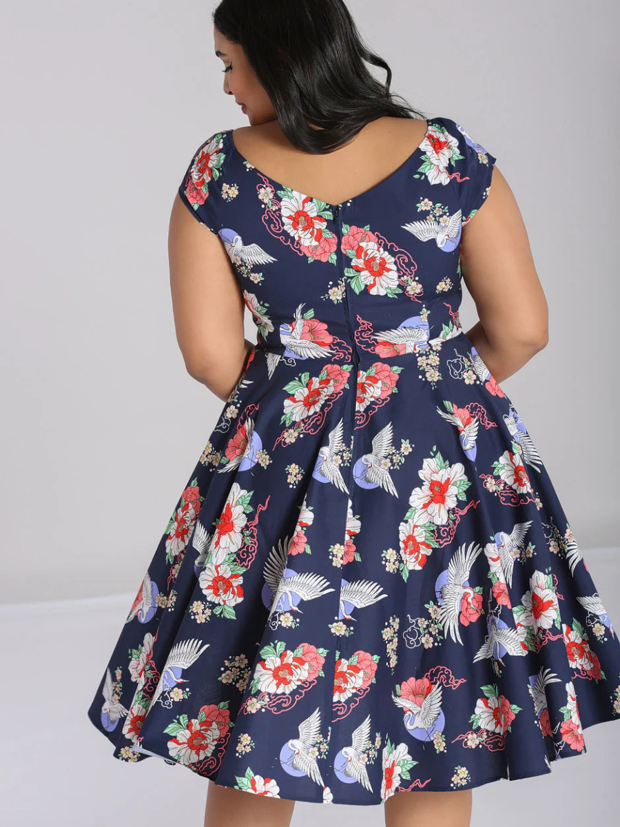 Ein Reise nach Fernost - ganz stilecht im Fifties-Look! Dunkelblaues Petticoatkleid im 50er Jahre Stil "Misa Midi Dress Navy" von Hell Bunny mit zauberhaften asiatisch inspirierten Print mit glückbringenden Kranichen und Blumen. Das ärmellose Kleid hat ein figurbetontes Oberteil mit schmeichelndem V-Ausschnitt vorn und hinten, perfekt für den Sommer. Eingearbeitete Gummizüge an der Schulter sorgen dafür, dass die breiten Träger auch beim Tanzen an Ort und Stelle bleiben. Der weit schwingende Rock macht mit und ohne Petticoat eine zauberhafte Figur, in ihm verstecken sich zwei praktische Taschen. Reißverschluss im Rücken. Ein Glücksbringer-Kleid mit einem Hauch asiatischer Exotik!