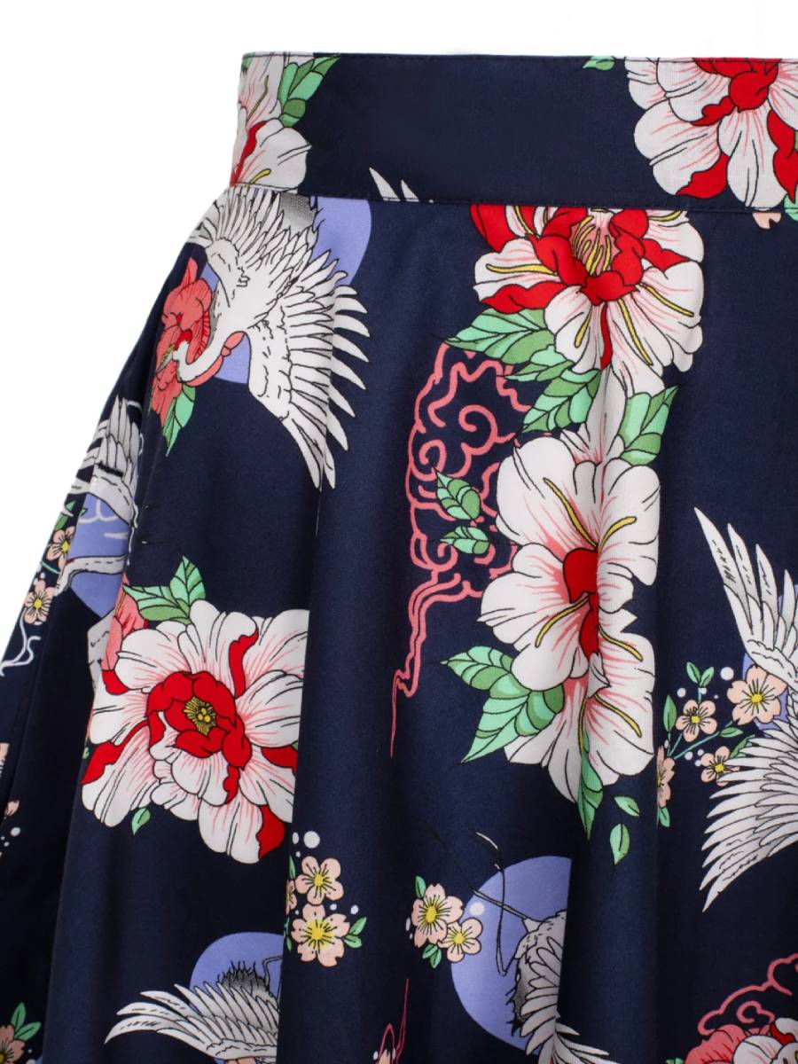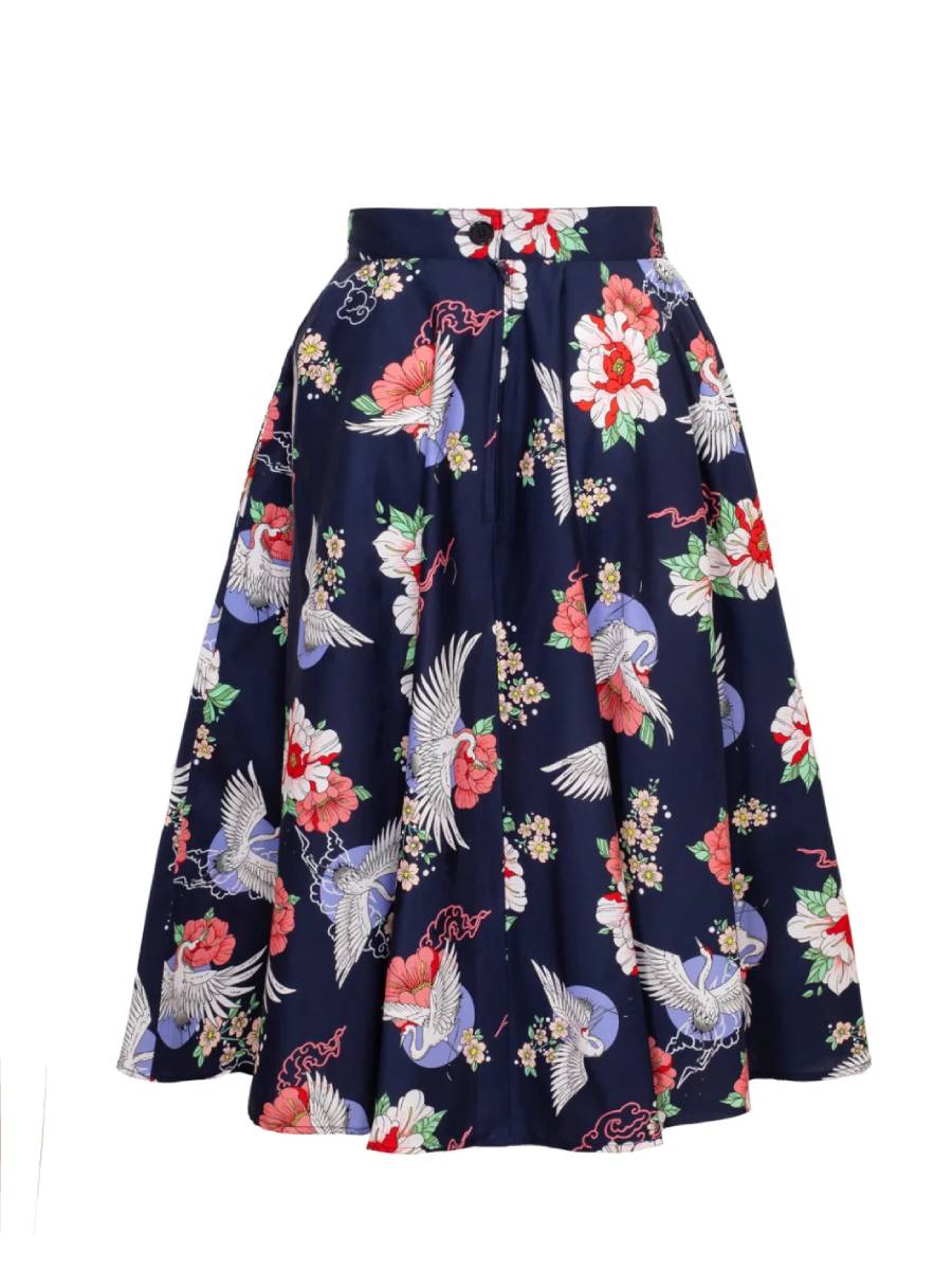 Fernöstlich inspirierter Vintage-Style: Weit schwingender dunkelblauer Rock im 50er Jahre Stil "Misa Skirt Navy" von Hell Bunny in einem zauberhaften asiatisch inspirierten Print mit Kranichen und Blumen. 4 cm breites Taillenband, zwei versteckte seitliche Eingrifftaschen. Der Rock wird hinten mit einem Reißverschluss und einem Knopf geschlossen.