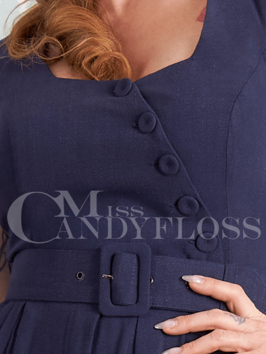 Sommerfrische an der See - da muss das Kleid elegant und bequem sein! Diese dunkelblaue 50er Jahre Swingkleid "Raula-Indigo" von Miss Candyfloss aus der "Cherie Bardot" Kollektion sorgt mit seiner asymmetrischen Knopfleiste am Oberteil für einen ganz besonderen Hingucker. Das ärmellose Sommerkleid aus luftigem Viskose-Leinen-Mix hat ein figurbetontes Oberteil im Stil der 1950er Jahre, dazu passend der weit schwingende Rock, der ganz modern zwei praktische Taschen versteckt. Zusätzlicher Reißverschluss im Rücken, passender Stoffgürtel. Ein edler Traum für lange Spaziergänge am Meer - an kühlen Sommerabenden kombinieren Sie das Kleid einfach mit dem passenden Blazer Lamia-Indigo (nicht im Lieferumfang enthalten) und halten so einer s-teiferen Brise stand. Ein perfekter Look für sommerliche Gartenparties und andere festliche Anlässe.