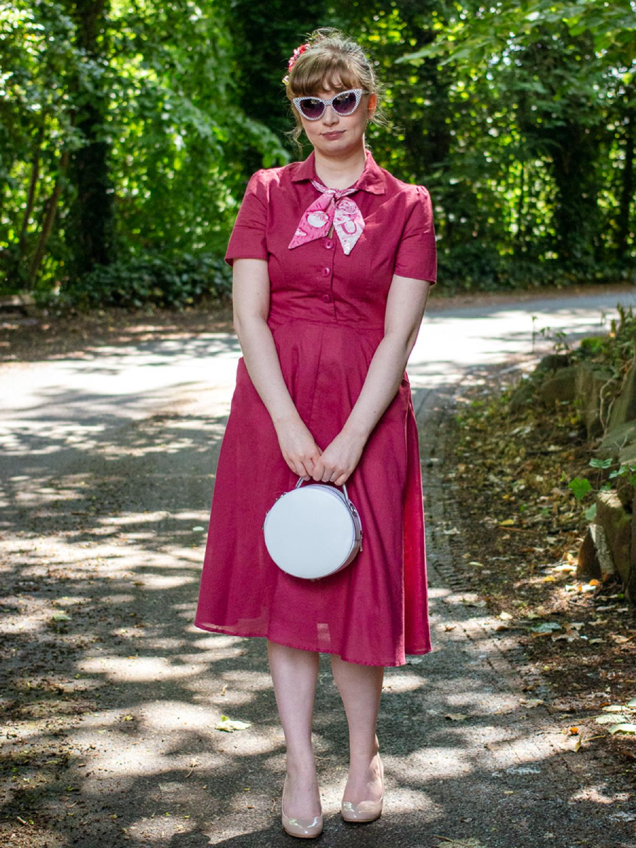 Ein wunderbar authentisches Hemdblusenkleid im 40er Jahre Stil, das bequem und lässig in den modernen Alltag passt: "Melody Shirtwaist Dress Berry Red" von Revival Vintage aus leichtem Baumwoll-Leinen-Mix ist nach historischem Vorbild gearbeitet, und das zeigt sich in den Details. Klassischer Hemdblusenschnitt mit V-Ausschnitt und spitzem Hemdkragen, ein besonderer Hingucker ist der schräg geschnittene Chevron-Effekt an der Schulterpasse und die drei auffälligen Knöpfe im Vintage-Stil vorn. Senkrechte Abnäher am Oberteil sorgen für einen guten Sitz, der ausgestellte Rock hat zwei praktische schräge Taschen vorn. Seitlicher Reißverschluss. Sehr angenehmes, leichtes Material, perfekt für sonnige Sommertage - da das Kleid leicht transparent ist, empfehlen wir ein Unterkleid.