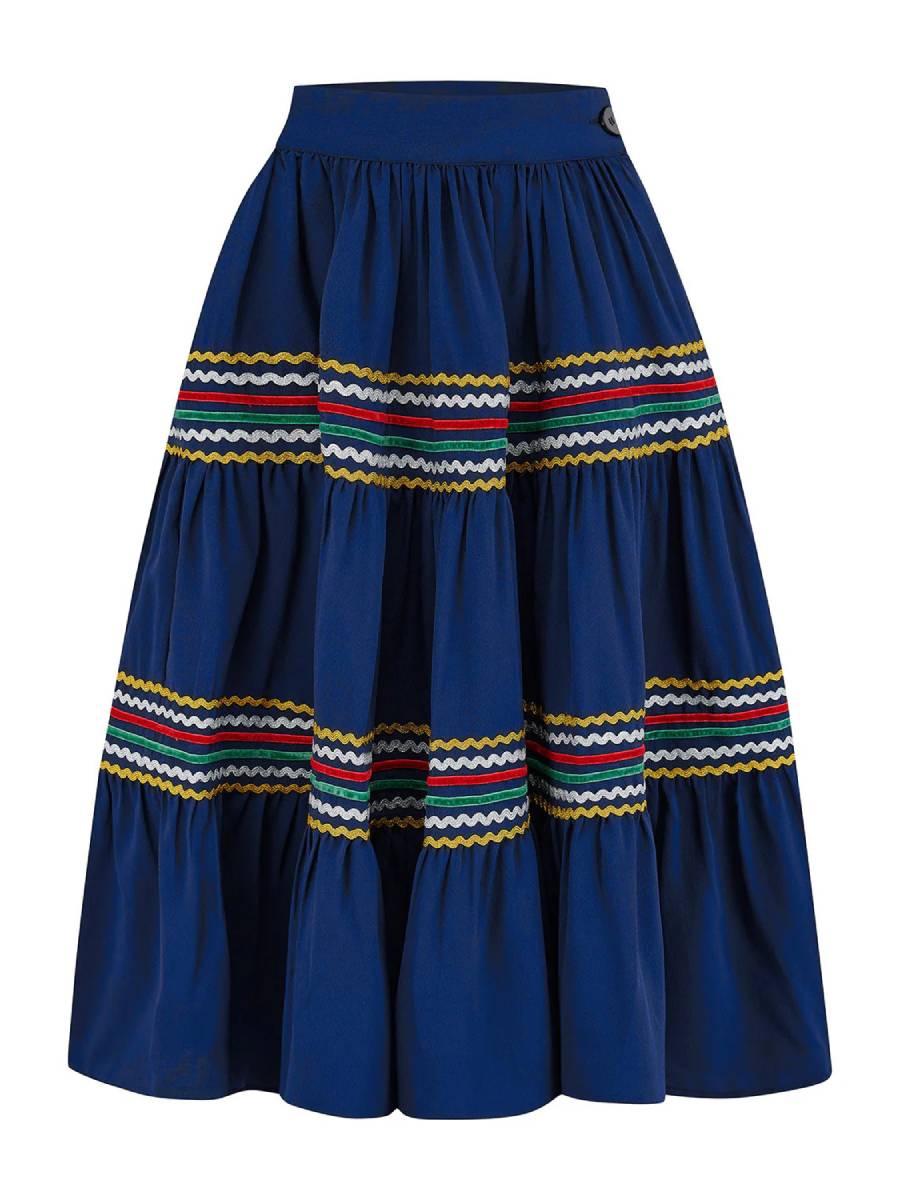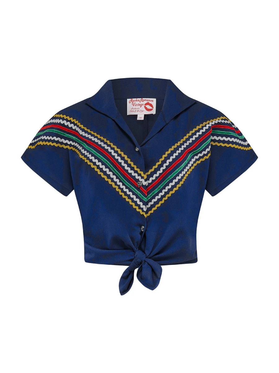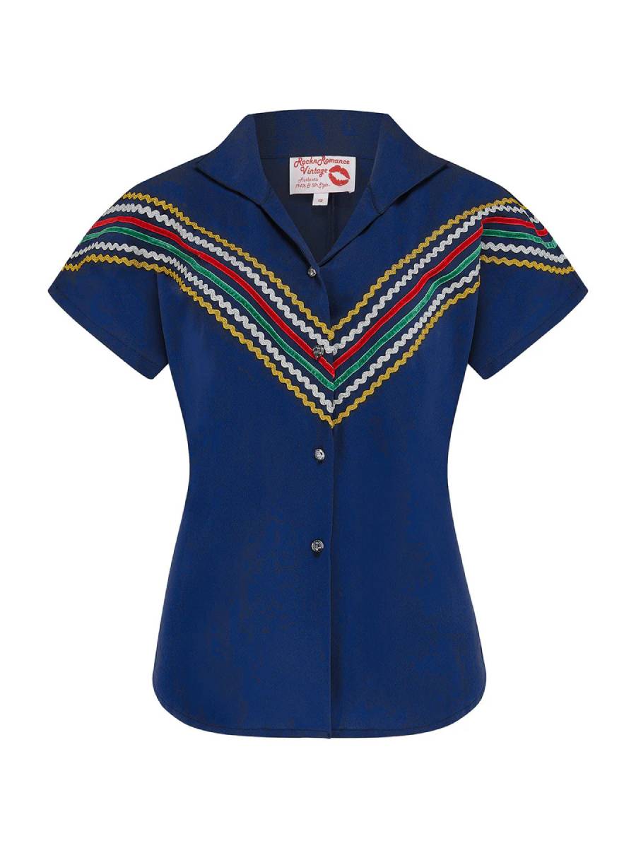 Margaritas schlürfen auf der Veranda im Sonnenuntergang ... In den 1940er und 1950er Jahren war ein mexikanisch inspiriertes "Patio Dress" der letzte Schrei unter modebewussten Ladies in den USA. Dieses wunderschöne dunkelblaue Set "Western Patio Set Navy" von Rock N Romance basiert auf einem Originalmodell der Fifties und sorgt mit seinen bunten geometrischen Zickzackborten für einen authentischen Vintage-Look. Praktischerweise besteht das Set aus Bluse und Rock, die auch einzeln getragen werden können - eine perfekte Basis für die Urlaubsgarderobe! Die Bluse hat einen V-Ausschnitt mit klassischem Kragen und kurze überschnittene Ärmel. Sie wird vorne mit glitzernden Knöpfen geschlossen und kann in den Rock gesteckt oder frech geknotet getragen werden - sie ist vorne etwas länger. Der schwingende Rock hat 3 Stufenvolants und zwei praktische Taschen. Er hat einen 5 cm breiten Taillenbund und ist in der Taille in Falten gelegt, seitlich wird er mit einem Reißverschluss und einem Knopf geschlossen. Auf zur Fiesta mit Speedy Gonzales!