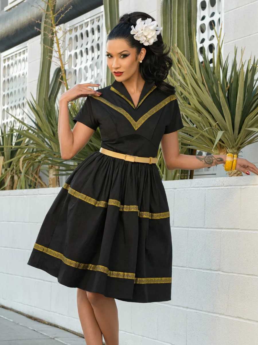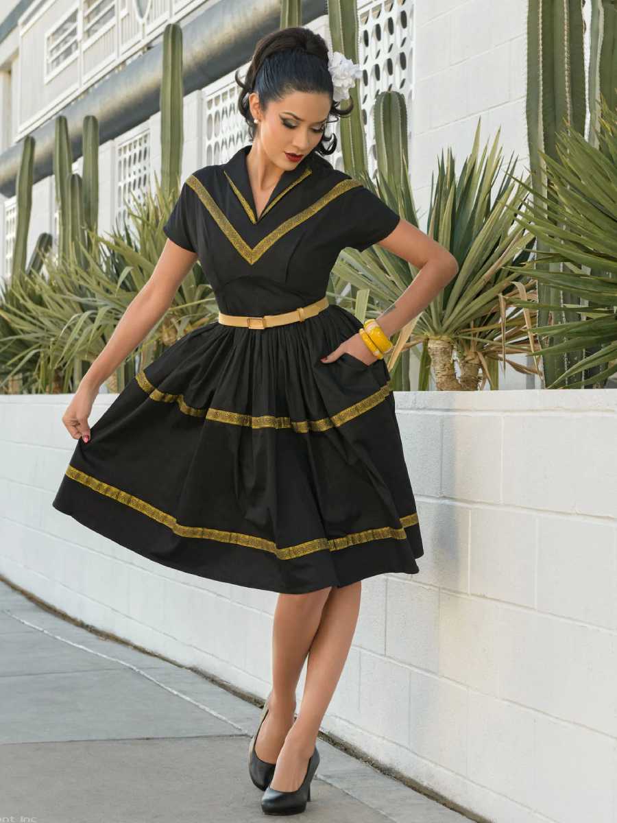 Ein Hauch von True Vintage: Schwarzes Swingkleid "Morning in Merida Swing Dress" von Rockin Bettie mit goldfarbenen Borten im Stil der mexikanischen Patio Dresses der 1940er und 1950er Jahre. Das raffinierte Oberteil hat einen V-Ausschnitt mit spitzem Kragen und überschnittene kurze Ärmel. Der weit ausgestellte Rock ist an der Taille in Falten gelegt und hat zwei versteckte Eingrifftaschen im Rock, die Goldborte ist auch am Rock wieder zu finden. Reißverschluss im Rücken. Sehr hochwertiger, fester Baumwollstoff mit einem Hauch von Stretch.